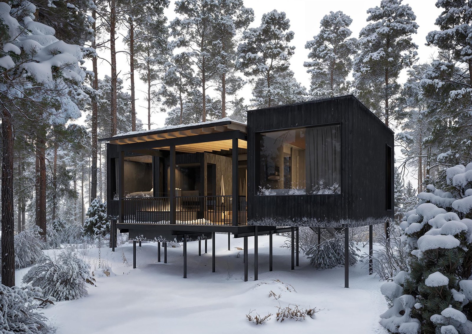 The complex is being built in a wild forest by the river. The villas will range from 50–57 sq. m, all featuring panoramic windows and private terraces. Some villas will have saunas or jacuzzis, while the resort area will include a gym, a reading room, and a space dedicated to gin tastings. The interiors will reflect Scandinavian minimalism with natural wood finishes.